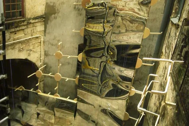 Le mur du mou joue avec le thème du festival «La rencontre» et déforme le reflet du visiteur et de l’architecture remarquable qui l’environne. Une invasion structurelle de tabourets, détournés en créatures à quatre pattes, soutient des miroirs déformants. La cour de cet hotêl du quartier de l’écusson se met en scène, avec nous, dans un monde devenu mou.