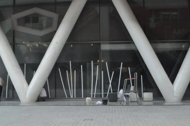 The Head-eater garden n°2 is an urban and Parisian adaptation of the original version (in Chaumont-sur-Loire). It reuses the original furniture and adds other elements to adapt the installation to its new context: the entrance courtyard of an architecture school. In a passage place, the white garden becomes a lounge for students. A pallet floor is laid out in the courtyard and secures the pots. White and graphic vegetation has been stuck on the glazing of the school, the garden has been urbanized and its vegetal spirit has been translated graphically. What was a passage or class break place has become a garden.